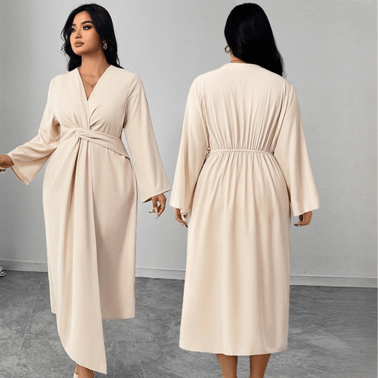 You will carry a sense of ease and control, your silhouette flowing with quiet assurance. The Plus Size Soft Wrap Dress with Defined Twist Waist will shape your presence without restriction. The wrap-inspired front and twisted waist detail will naturally guide the eye, creating balance while allowing the fabric to fall smoothly over your curves.