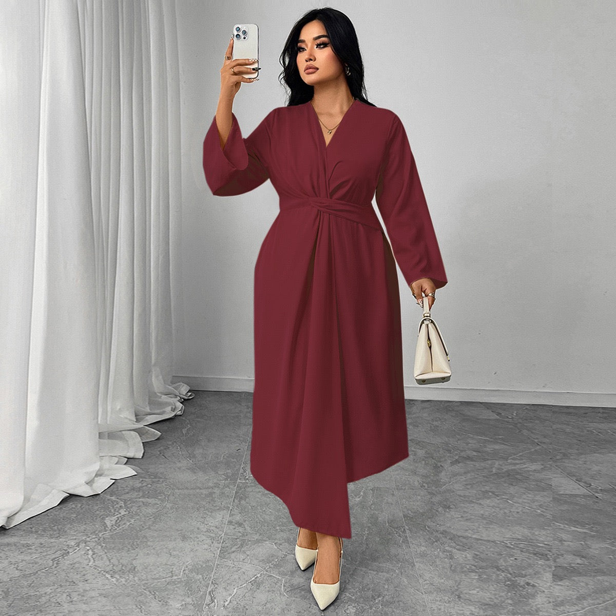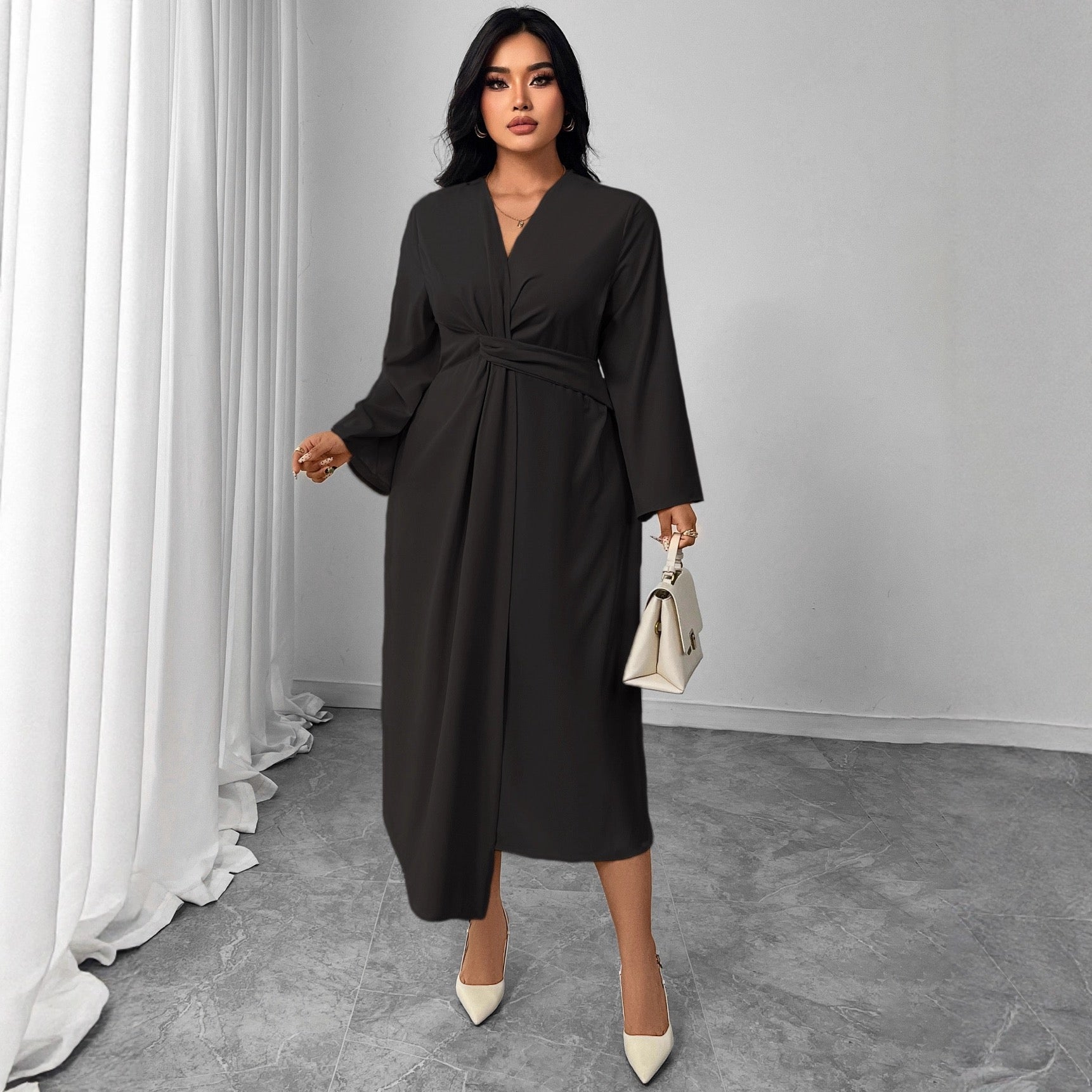 - Design: Wrap-inspired silhouette, twisted waist detail, long sleeves, fluid midi length