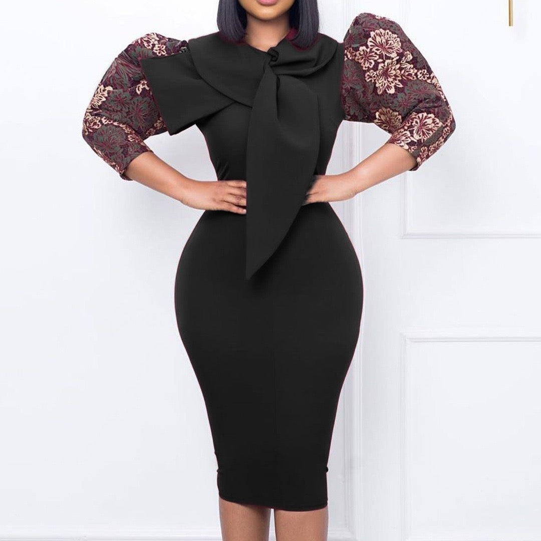 - Design: Structured midi cut, front bow detail, patterned puff sleeves, clean fitted body, balanced proportions.